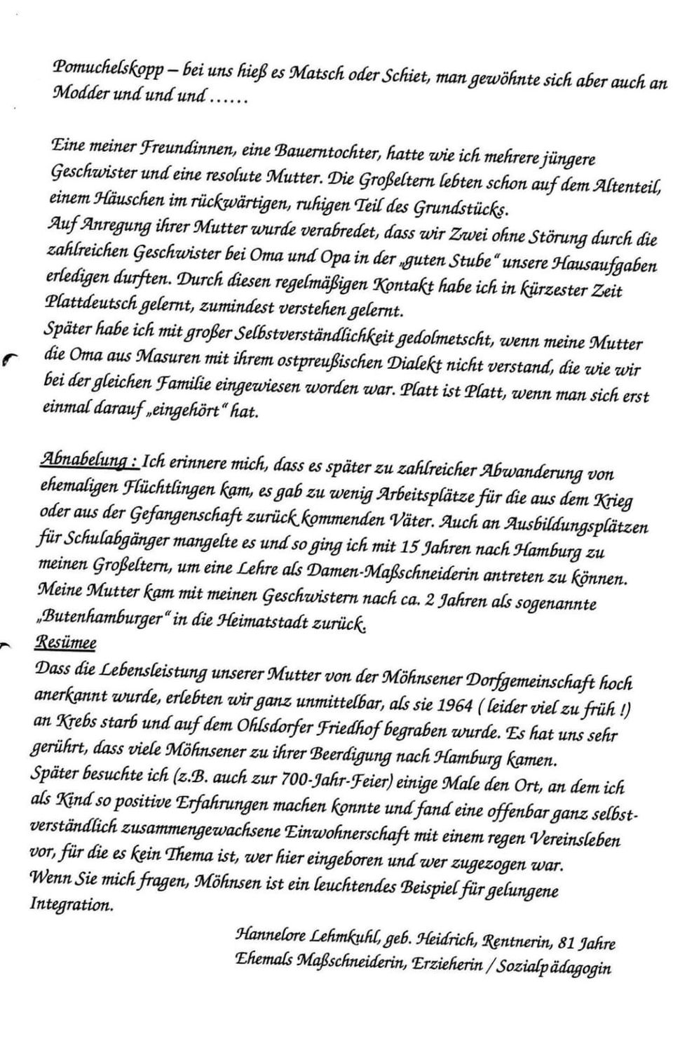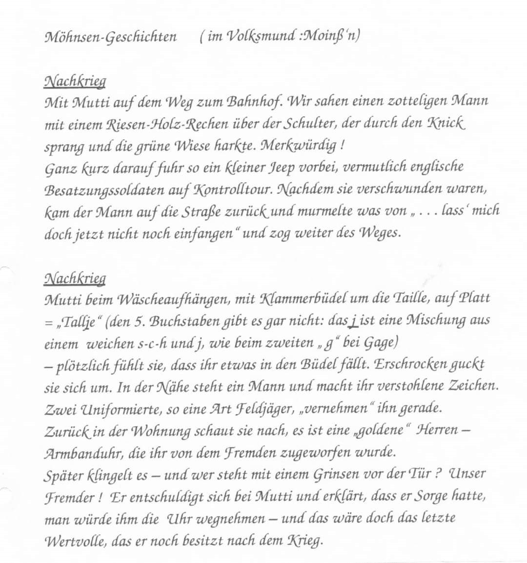 Es folgen jetzt ein paar kleine Geschichten die sich Hannelore in Ihrer Zeit hier in Möhnsen notiert hat,